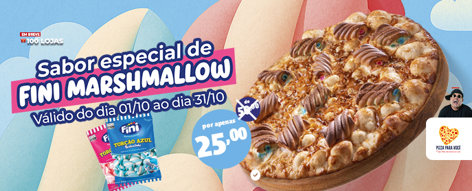 Durante todo o mês de outubro, a rede Pizza Para Você traz uma novidade exclusiva para os apaixonados por doce: a pizza sabor Fini Marshmallow.